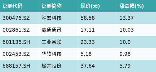 截至午间收盘,苹果概念主题涨跌幅最高的五只股票为:胜宏科技(300476.SZ)、瀛通通讯(002861.SZ)、工业富联(601138.SH)、华软科技(002453.SZ)与松井股份(688157.SH)。详情见下表: