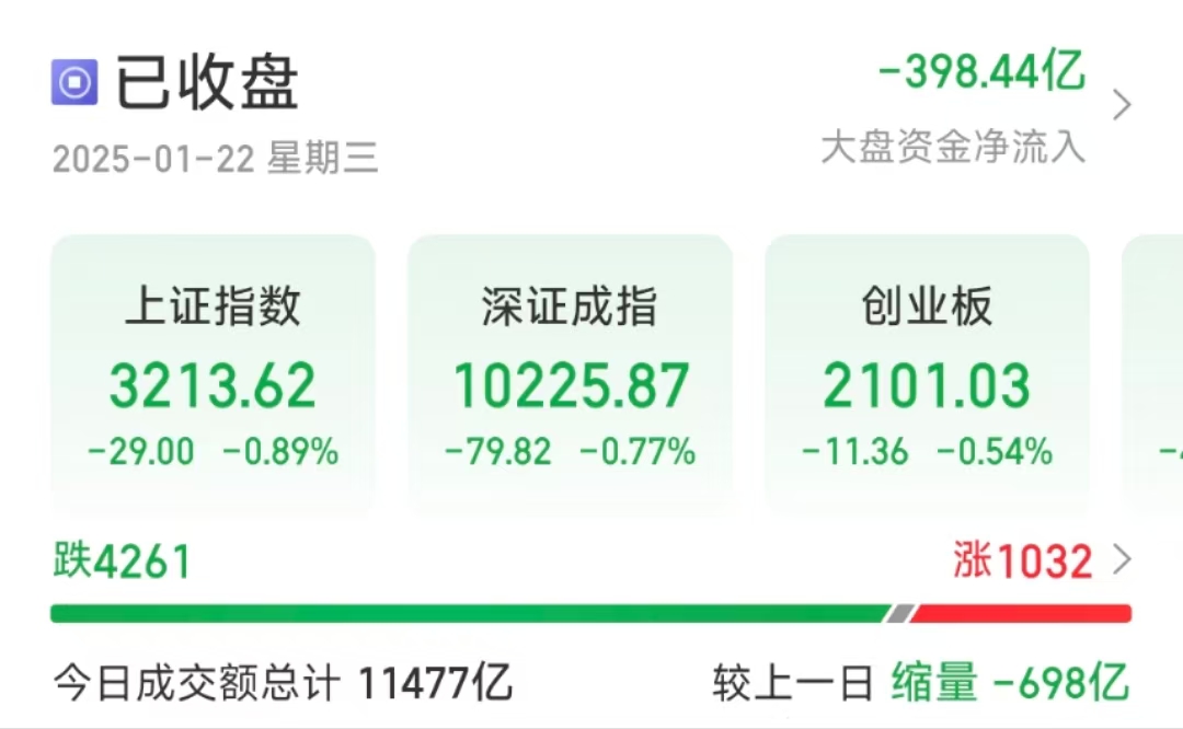 1月22日,A股大盘震荡调整。截至收盘,沪指跌0.89%,深证成指跌0.77%,创业板指跌0.54%,全天成交额1.15万亿元,较上一个交易日缩量698亿元。