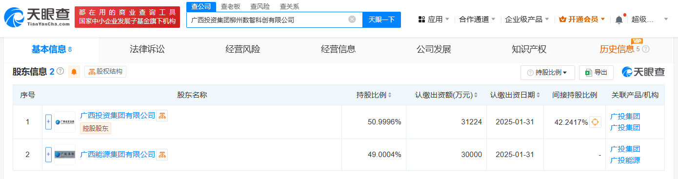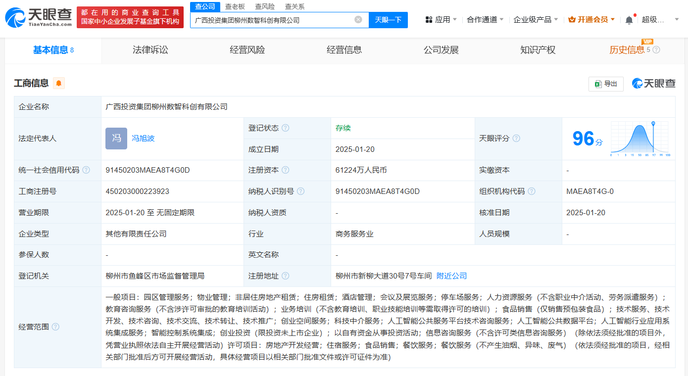 每经AI快讯,天眼查App显示,近日,广西投资集团柳州数智科创有限公司成立,法定代表人为冯旭波,注册资本约6.12亿元,经营范围包括园区管理服务、物业管理、非居住房地产租赁、住房租赁、房地产开发经营等。股东信息显示,该公司由广西投资集团有限公司及旗下广西能源集团有限公司共同持股。