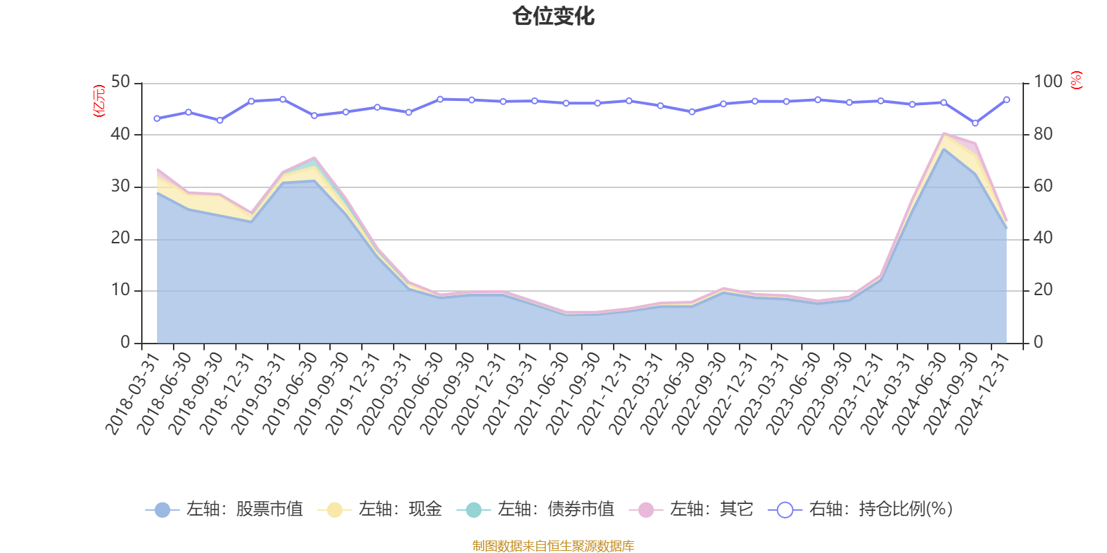 据定期报告数据统计,近三年平均股票仓位为91.63%,同类平均为83.7%。2020年上半年末基金达到93.74%的最高仓位,2024年三季度末最低,为84.59%。