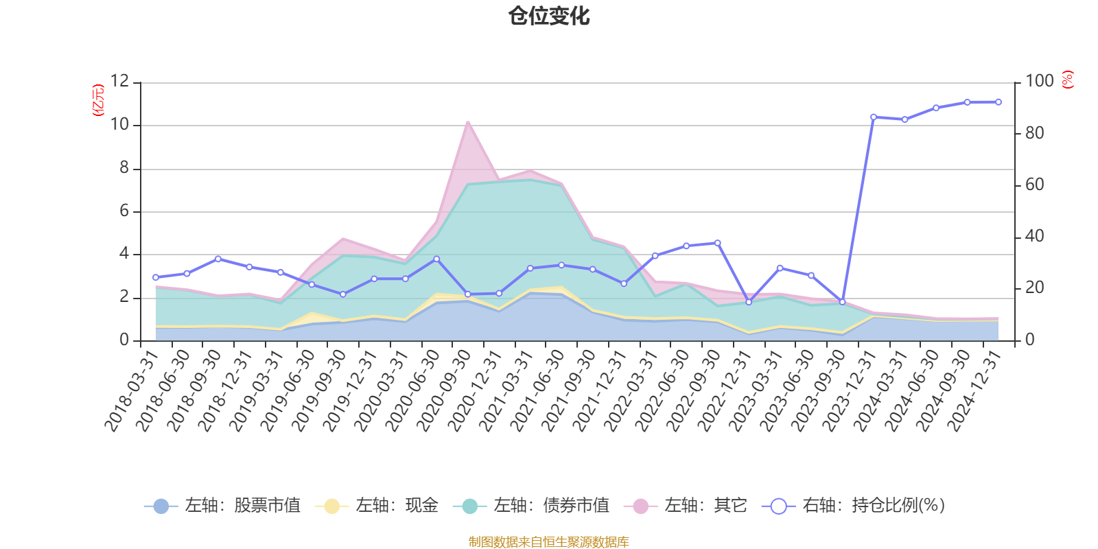 据定期报告数据统计,近三年平均股票仓位为53.15%,同类平均为79.89%。2024年末基金达到92.38%的最高仓位,2022年末最低,为14.94%。