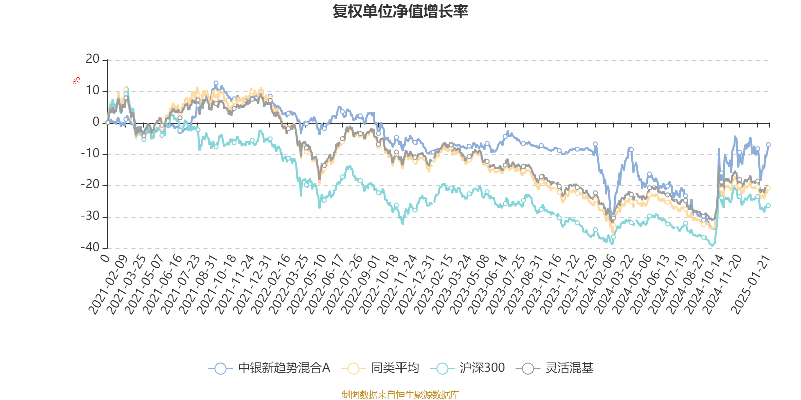 截至1月21日,中银新趋势混合A近三个月复权单位净值增长率为3.36%,位于同类可比基金169/920;近半年复权单位净值增长率为21.24%,位于同类可比基金103/920;近一年复权单位净值增长率为14.24%,位于同类可比基金342/920;近三年复权单位净值增长率为-11.03%,位于同类可比基金209/898。
