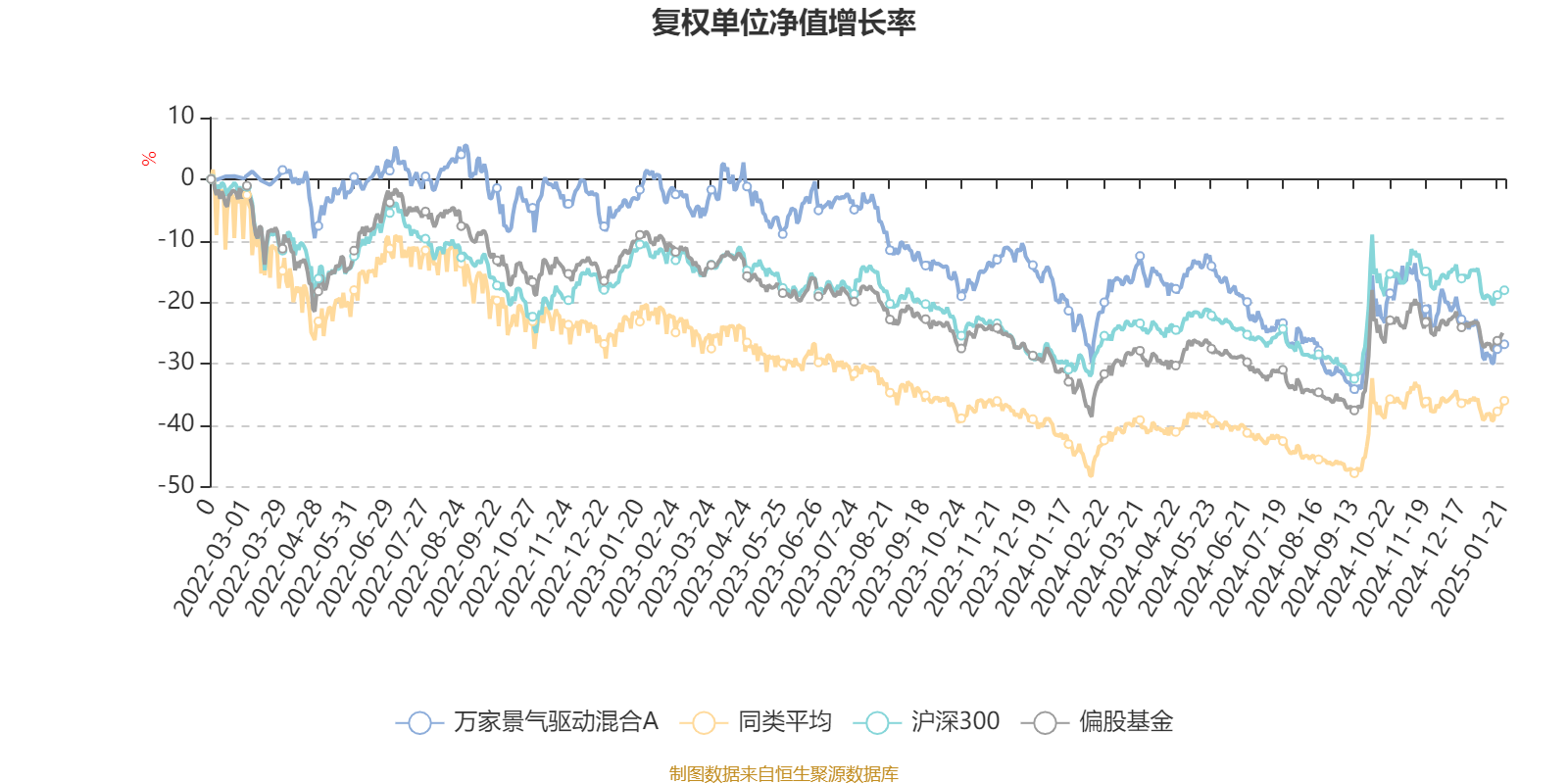 截至1月21日,万家景气驱动混合A近三个月复权单位净值增长率为-9.58%,位于同类可比基金635/646;近半年复权单位净值增长率为-4.49%,位于同类可比基金627/645;近一年复权单位净值增长率为-6.47%,位于同类可比基金618/633。