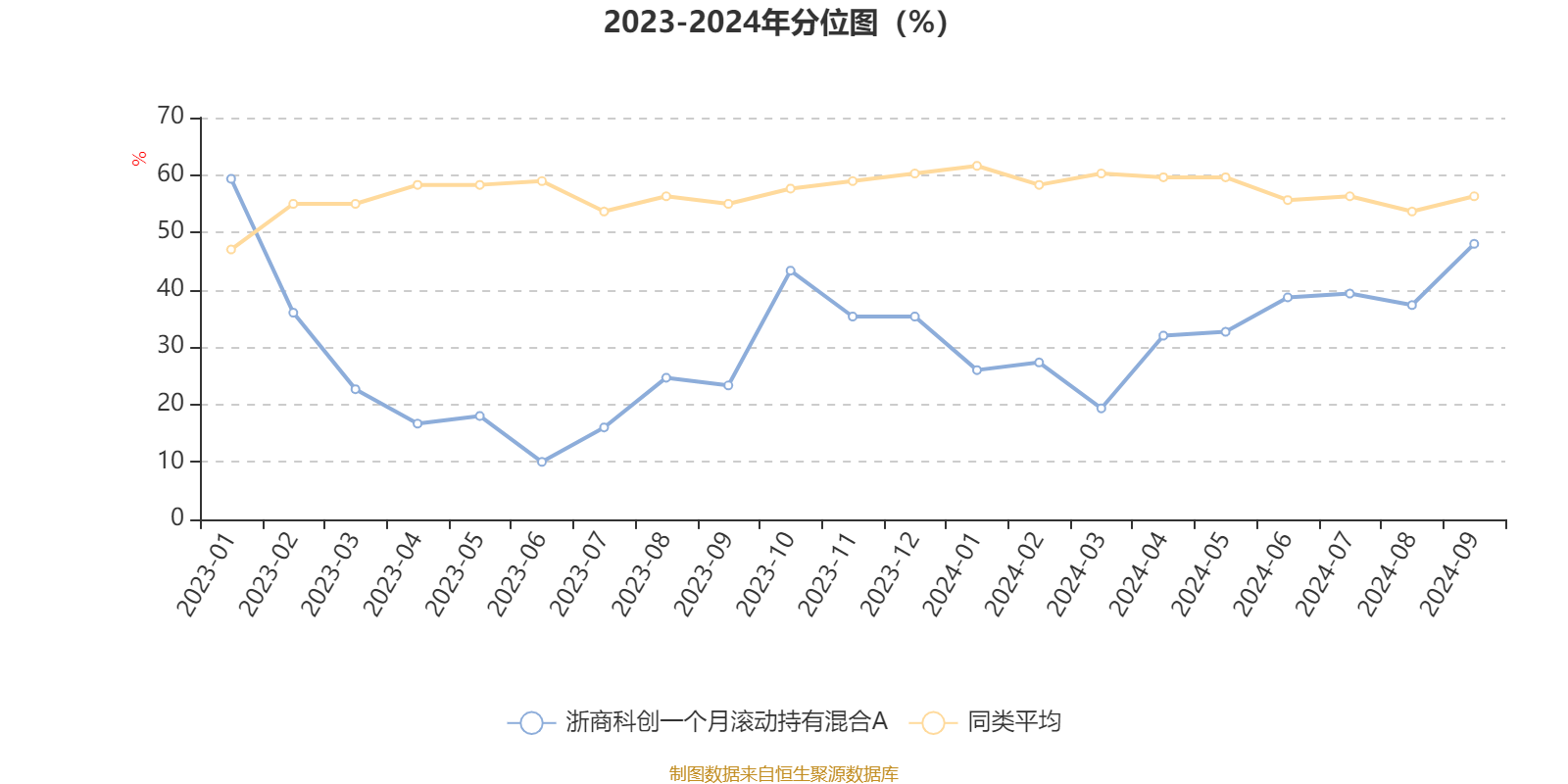 通过所选区间该基金净值增长率分位图,可以观察该基金与同类基金业绩比较情况。图为坐标原点到区间内某时点的净值增长率在同类基金中的分位数。