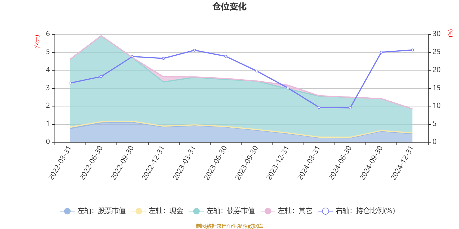 据定期报告数据统计,近三年平均股票仓位为19.68%,同类平均为18.69%。2024年末基金达到25.66%的最高仓位,2024年上半年末最低,为9.55%。