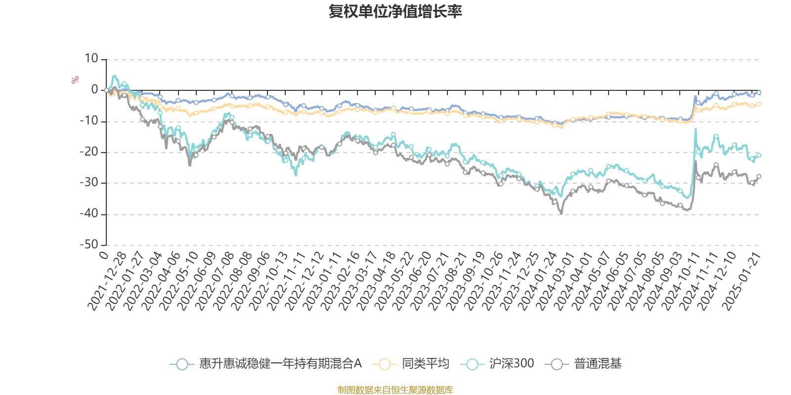 截至1月21日,惠升惠诚稳健一年持有期混合A近三个月复权单位净值增长率为3.48%,位于同类可比基金49/670;近半年复权单位净值增长率为8.57%,位于同类可比基金53/670;近一年复权单位净值增长率为10.76%,位于同类可比基金90/664;近三年复权单位净值增长率为-0.38%,位于同类可比基金356/525。