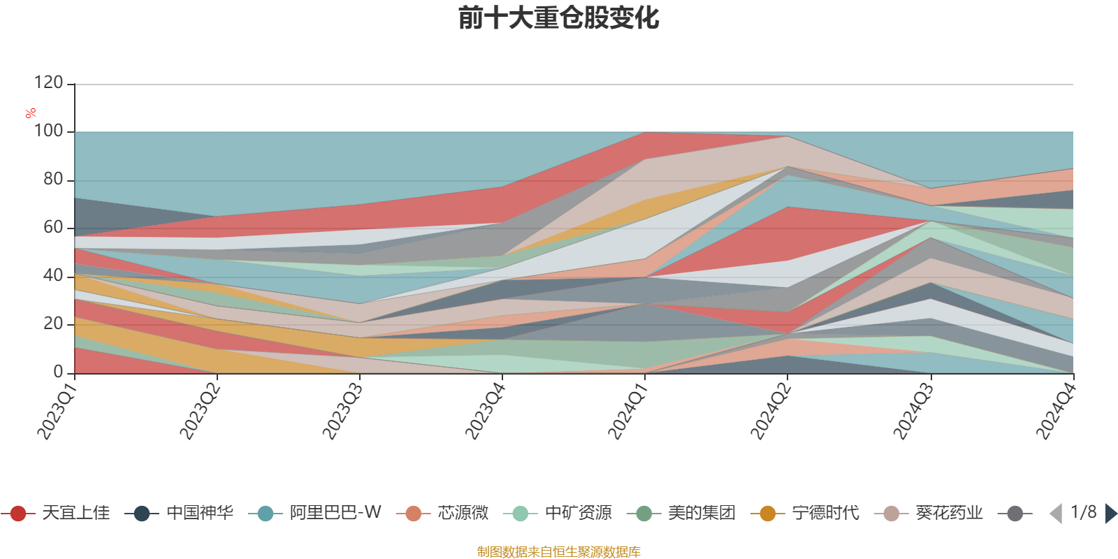 该基金持股集中度较高,近2年前十大重仓股集中度长期超过60%。截至2024年四季度末,基金十大重仓股分别是中兴通讯、大秦铁路、长江电力、云路股份、李宁、五粮液、亚钾国际、盐湖股份、森麒麟、中芯国际。