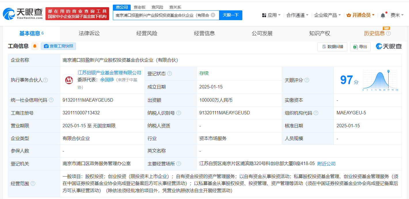 南方财经1月22日电,天眼查App显示,近日,南京浦口招盈新兴产业股权投资基金合伙企业(有限合伙)成立,执行事务合伙人为江苏招银产业基金管理有限公司,出资额10亿人民币,经营范围为股权投资,创业投资,自有资金投资的资产管理服务,以自有资金从事投资活动,私募股权投资基金管理,创业投资基金管理服务,以私募基金从事股权投资、投资管理、资产管理等活动。合伙人信息显示,该基金由招银金融旗下上海旗骥科技合伙企业(有限合伙)、招银国际资本管理(深圳)有限公司、江苏招银产业基金管理有限公司以及科创财务管理有限公司、南京浦口高质量发展投资基金合伙企业(有限合伙)共同出资。