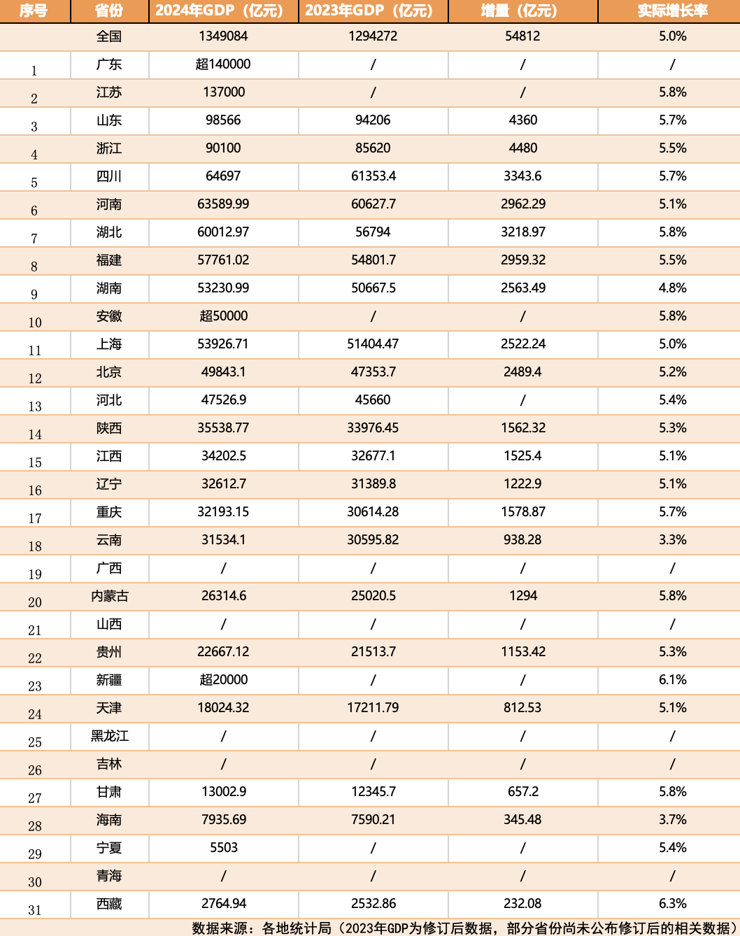 各省份2024年GDP陆续公布。截至1月22日,已有26个省份公布了具体数据或大致数据。