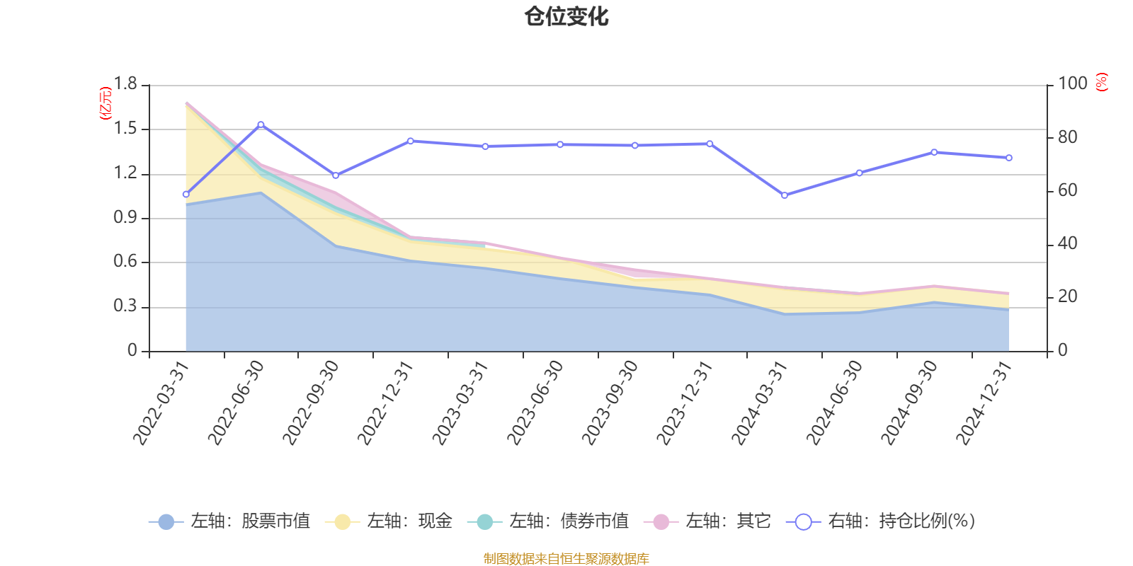 据定期报告数据统计,近三年平均股票仓位为72.63%,同类平均为83.7%。2022年上半年末基金达到85.11%的最高仓位,2024年一季度末最低,为58.56%。
