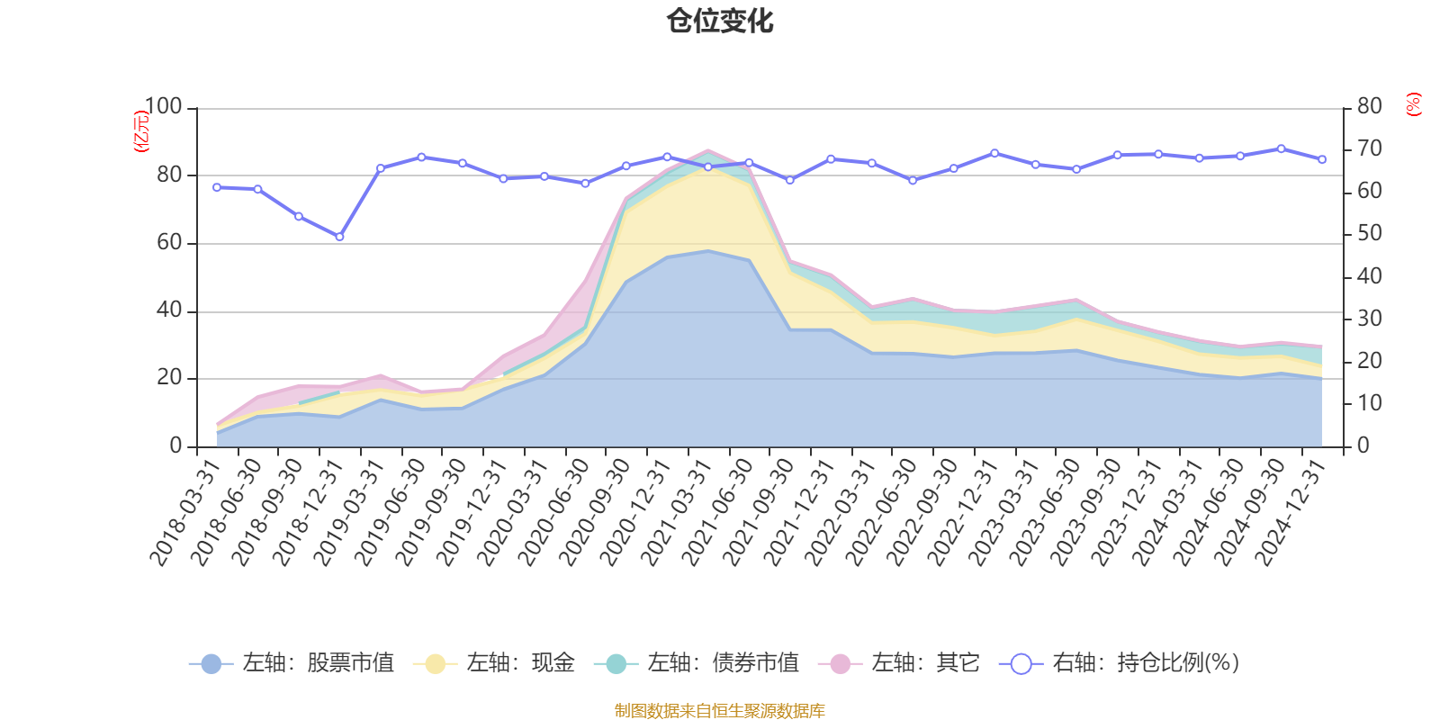 据定期报告数据统计,近三年平均股票仓位为67.52%,同类平均为79.89%。2024年三季度末基金达到70.39%的最高仓位,2018年末最低,为49.59%。