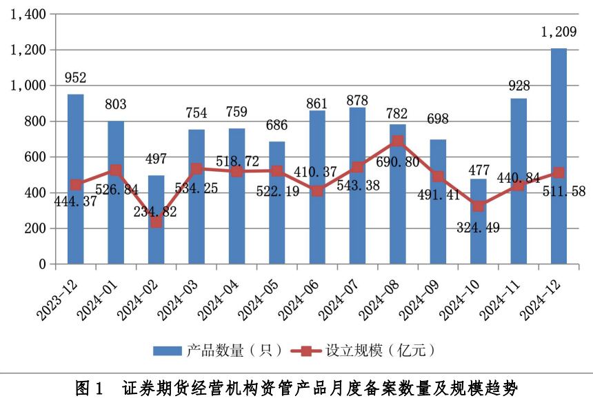 2024年12月,证券期货经营机构共备案私募资管产品1,209只,环比增加30.28%,同比增加27.00%;设立规模511.58亿元,环比增加16.05%,同比增加15.12%。