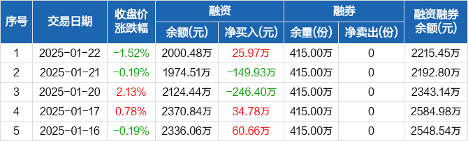 锂电池ETF:融资净买入25.97万元,融资余额2000.48万元(01-22)