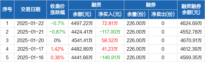 化工ETF:融资净买入72.81万元,融资余额4497.22万元(01-22)