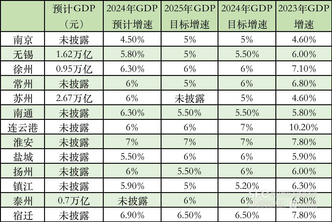 展望2025年,对比2024年预期增长目标,南京、徐州、南通、淮安等7城持平,无锡、常州、连云港、扬州、镇江等5城下调。