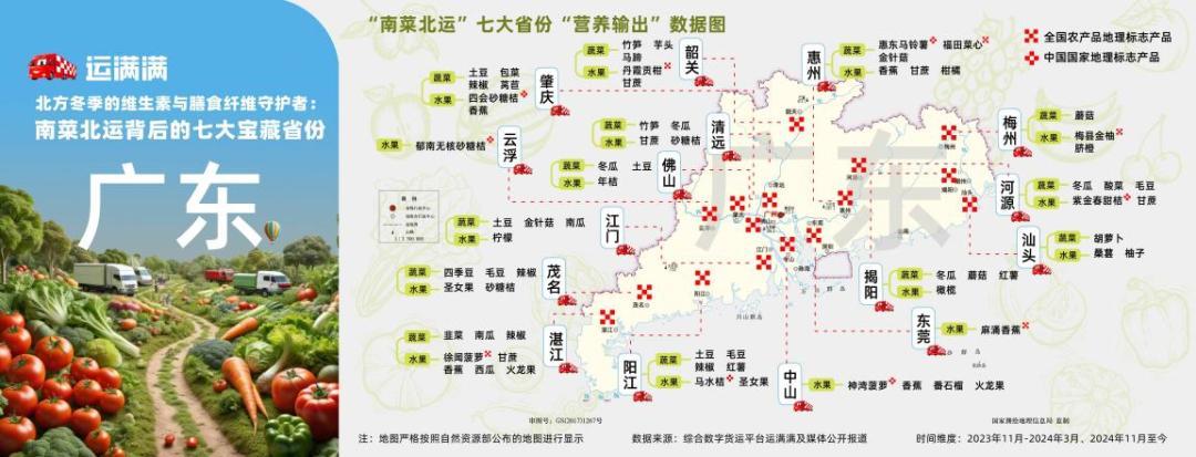 春节临近,北方地区早已进入寒冬模式,“南菜北运”物流活动进入年度高峰期。近日,数字货运平台运满满发布“南菜北运”七大省份“营养输出”数据图。这份数据图涉及到7个省份在2023年11月到2024年3月、2024年11月至今的两个重要运输时间段的蔬菜、水果流动大数据,让人更直观的感受到“南菜北运”中水果蔬菜的流向。