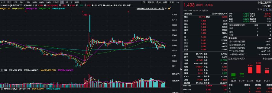 相关ETF方面,中证红利ETF(515080)高开高走,截至发稿涨1.63%,成交额超5100万元,换手率0.77%,盘初交投活跃,溢折率0.07%,盘中频现溢价交易。