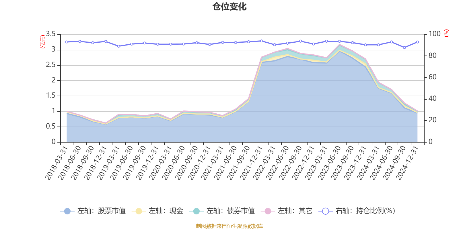 据定期报告数据统计,近三年平均股票仓位为91.71%,同类平均为88.12%。2021年末基金达到93.87%的最高仓位,2024年三季度末最低,为87.79%。