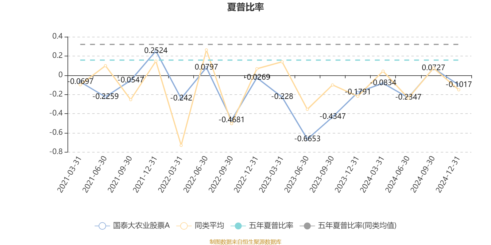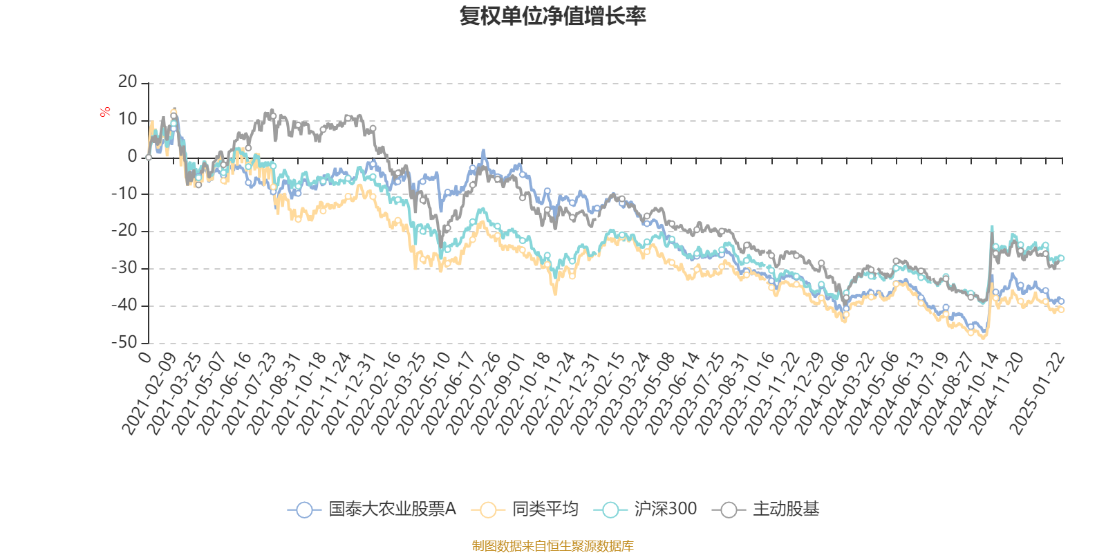 截至1月22日,国泰大农业股票A近三个月复权单位净值增长率为-4.09%,位于同类可比基金21/46;近半年复权单位净值增长率为3.67%,位于同类可比基金18/46;近一年复权单位净值增长率为3.82%,位于同类可比基金22/46;近三年复权单位净值增长率为-34.51%,位于同类可比基金29/42。