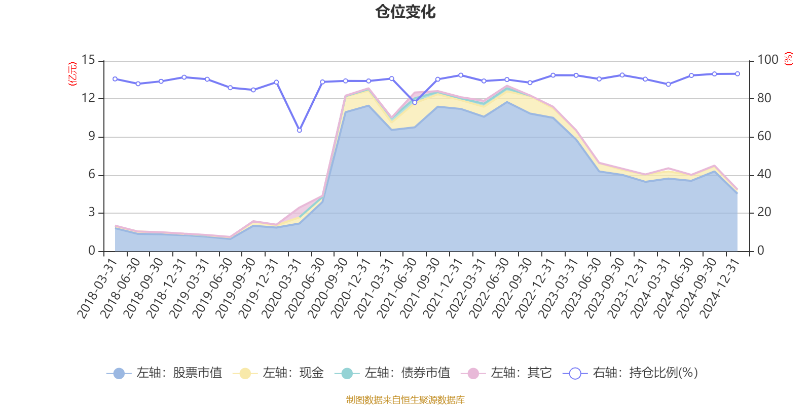 据定期报告数据统计,近三年平均股票仓位为91.02%,同类平均为87.27%。2024年末基金达到93.16%的最高仓位,2020年一季度末最低,为63.53%。