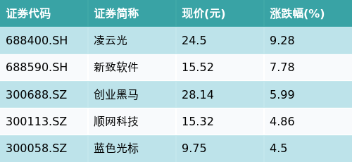 截至午间收盘,Web3.0主题涨跌幅最高的五只股票为:凌云光(688400.SH)、新致软件(688590.SH)、创业黑马(300688.SZ)、顺网科技(300113.SZ)与蓝色光标(300058.SZ)。详情见下表: