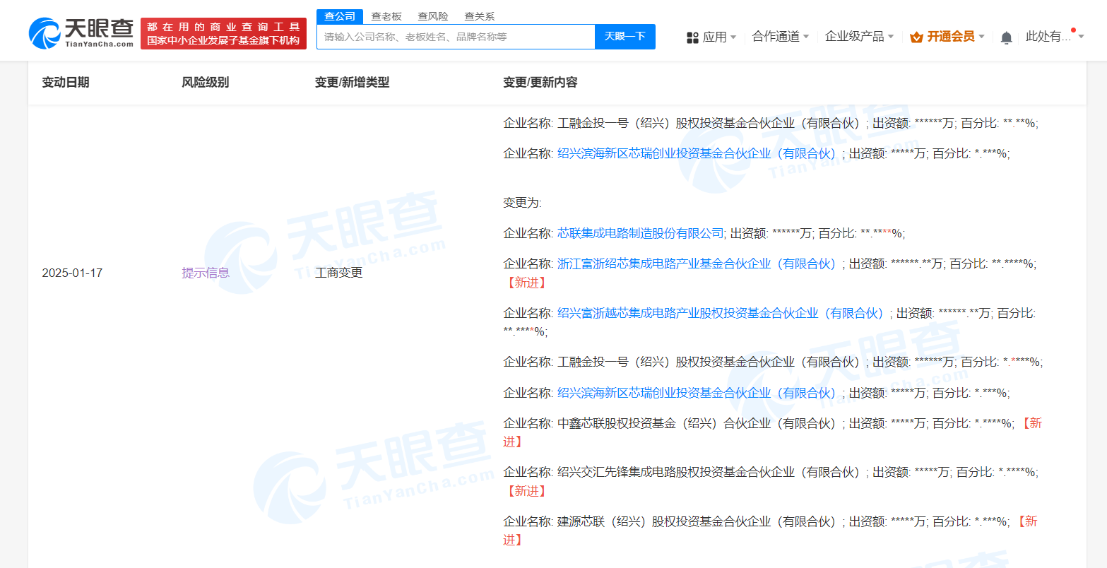 天眼查App显示,近日,芯联先锋集成电路制造(绍兴)有限公司发生工商变更,股东新增建信投资旗下建源芯联(绍兴)股权投资基金合伙企业(有限合伙)、交银投资旗下绍兴交汇先锋集成电路股权投资基金合伙企业(有限合伙)等为股东,注册资本由约81.8亿人民币增至约112.3亿人民币,同时,部分主要人员也发生变更。芯联先锋集成电路制造(绍兴)有限公司成立于2021年12月,法定代表人为赵奇,经营范围含集成电路制造、集成电路芯片及产品制造、集成电路设计、集成电路芯片设计及服务、集成电路销售、集成电路芯片及产品销售、电力电子元器件销售、电力电子元器件制造等。股东信息显示,该公司现由芯联集成(688469)、绍兴富浙越芯集成电路产业股权投资基金合伙企业(有限合伙)、工融金投一号(绍兴)股权投资基金合伙企业(有限合伙)及上述新增股东等共同持股。