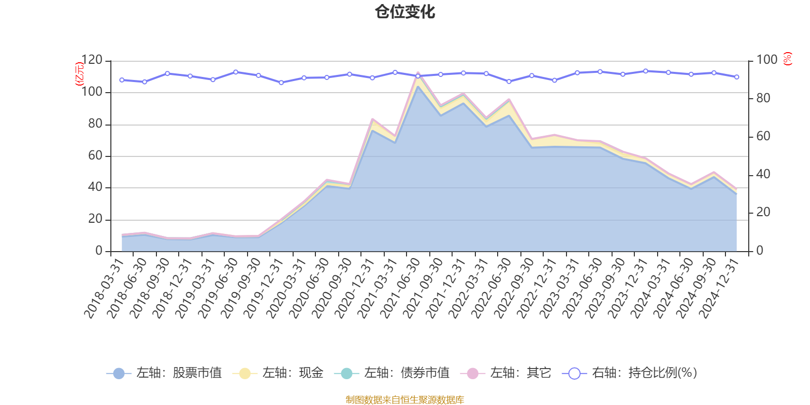 据定期报告数据统计,近三年平均股票仓位为92.65%,同类平均为88.07%。2023年末基金达到94.59%的最高仓位,2019年末最低,为88.54%。