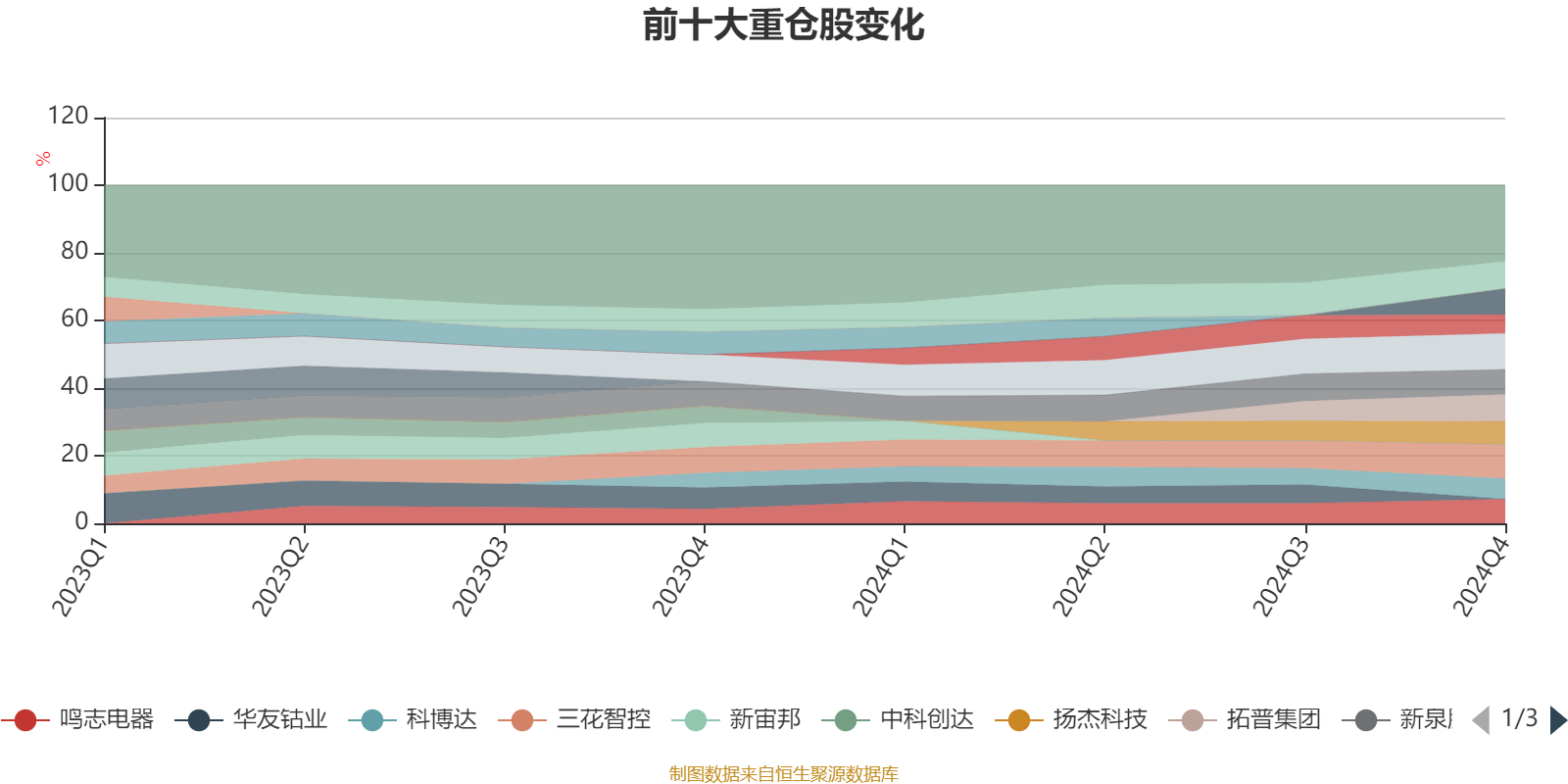 该基金持股集中度较高,近2年前十大重仓股集中度长期超过60%。截至2024年四季度末,基金十大重仓股分别是宁德时代、三花智控、宏发股份、拓普集团、峰岹科技、新泉股份、鸣志电器、扬杰科技、科博达、伊之密。