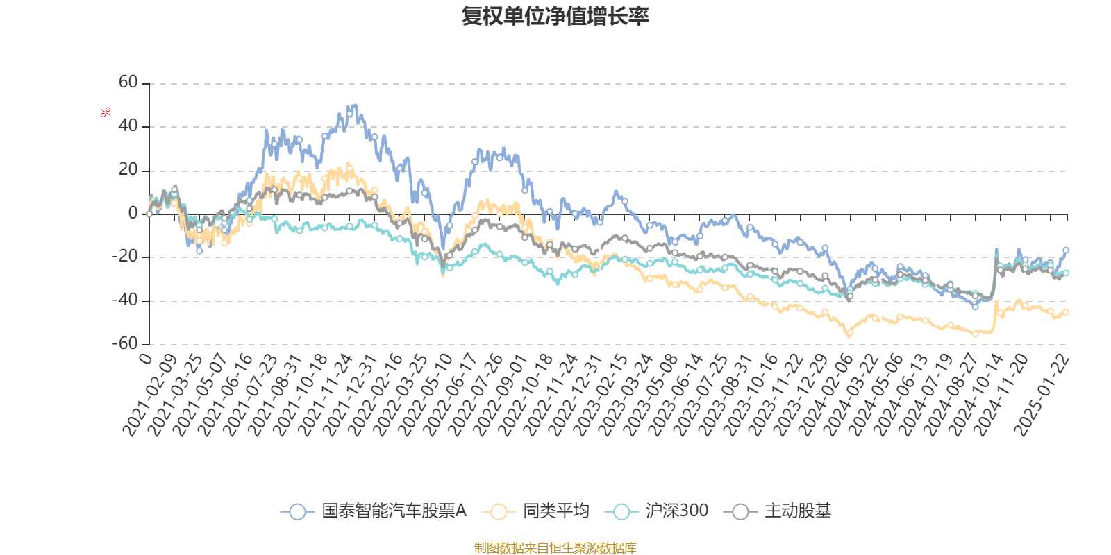 截至1月22日,国泰智能汽车股票A近三个月复权单位净值增长率为8.81%,位于同类可比基金2/42;近半年复权单位净值增长率为28.11%,位于同类可比基金3/42;近一年复权单位净值增长率为18.29%,位于同类可比基金14/41;近三年复权单位净值增长率为-34.88%,位于同类可比基金15/29。