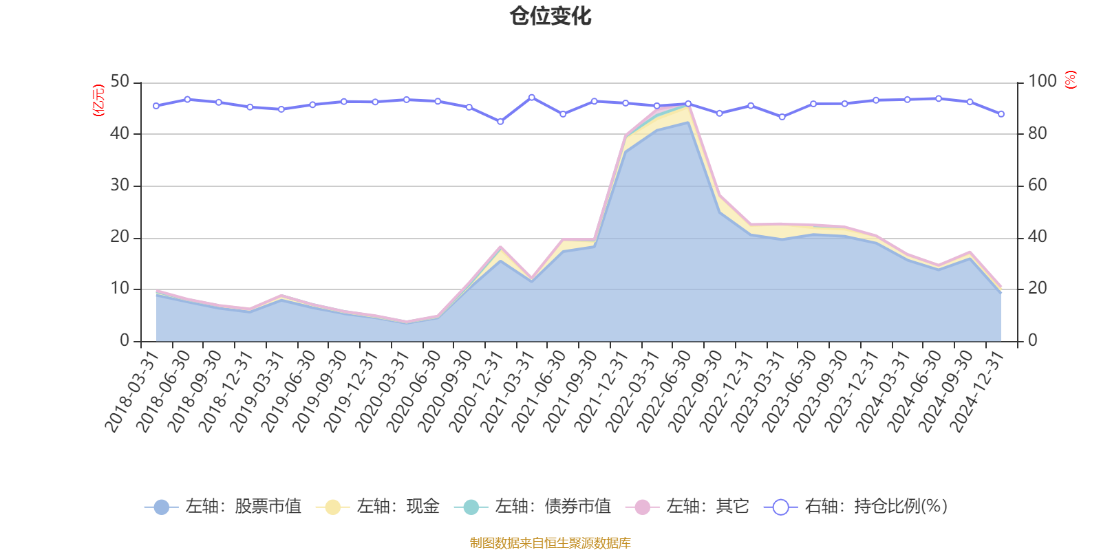 据定期报告数据统计,近三年平均股票仓位为91.08%,同类平均为88.07%。2021年一季度末基金达到94.25%的最高仓位,2020年末最低,为84.91%。