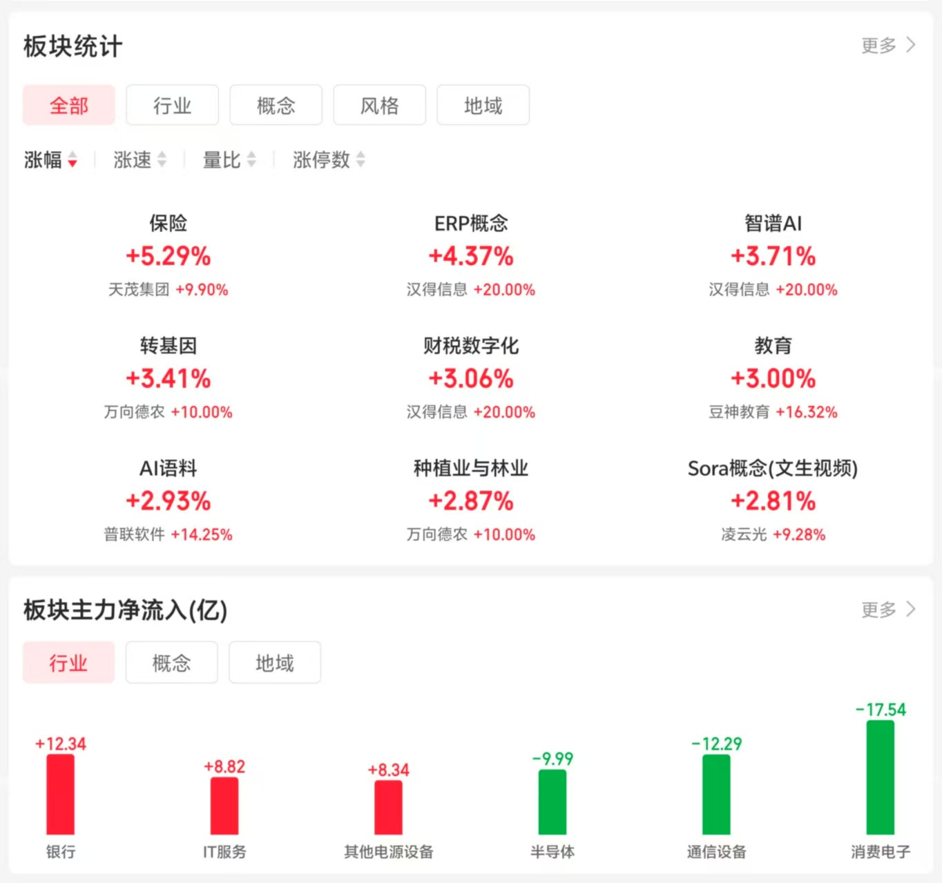 分板块来看,截至午盘收盘,保险板块以5.29%涨幅领涨,教育、种植业与林业、多元金融、IT服务、银行板块表现活跃,均涨超2%;银行板块吸引主力资金净流入居首,达12.34亿元。