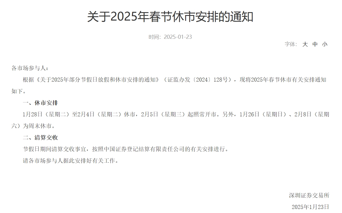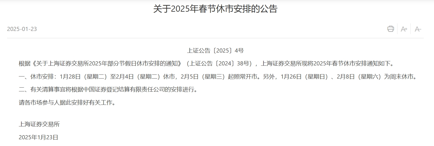 沪深交易所2025年春节休市安排:1月28日至2月4日休市,2月5日起照常开市