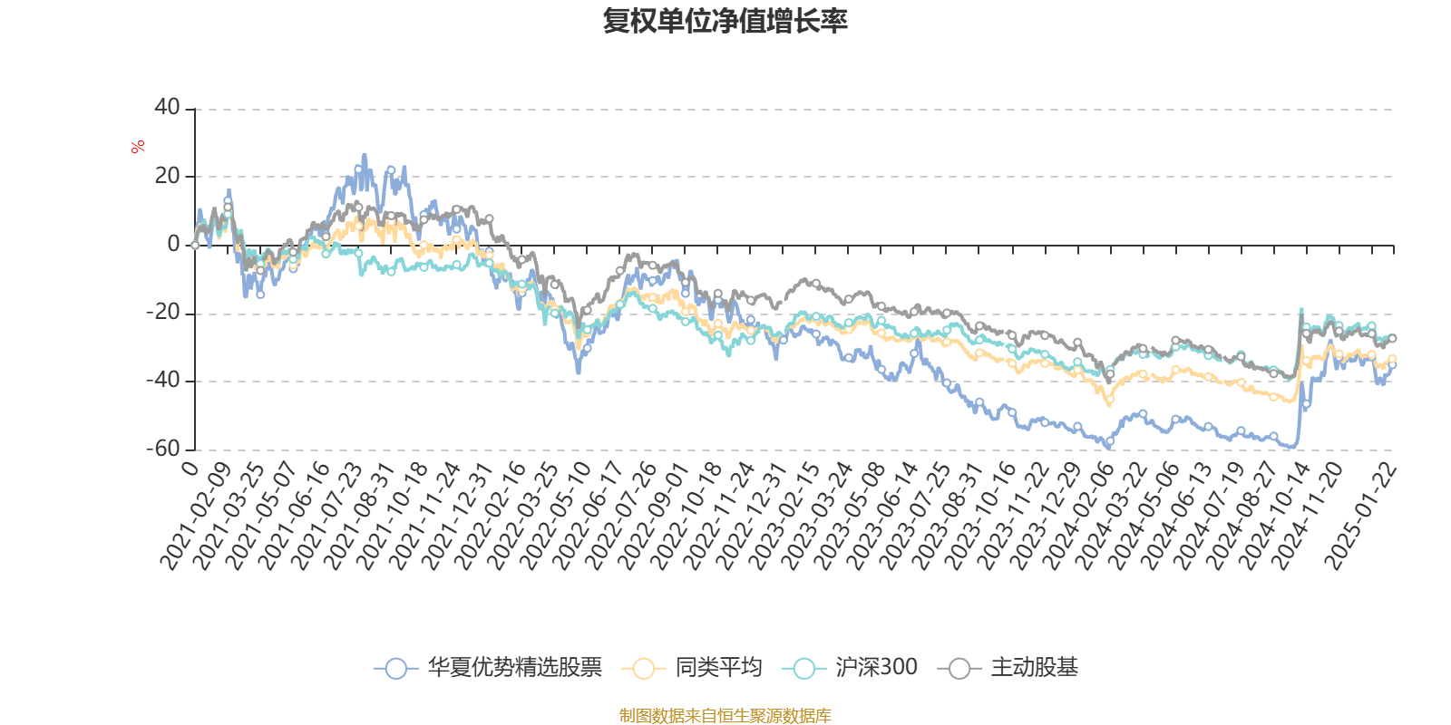 截至1月22日,华夏优势精选股票近三个月复权单位净值增长率为6.87%,位于同类可比基金7/100;近半年复权单位净值增长率为41.69%,位于同类可比基金2/100;近一年复权单位净值增长率为54.14%,位于同类可比基金2/97;近三年复权单位净值增长率为-27.59%,位于同类可比基金51/76。