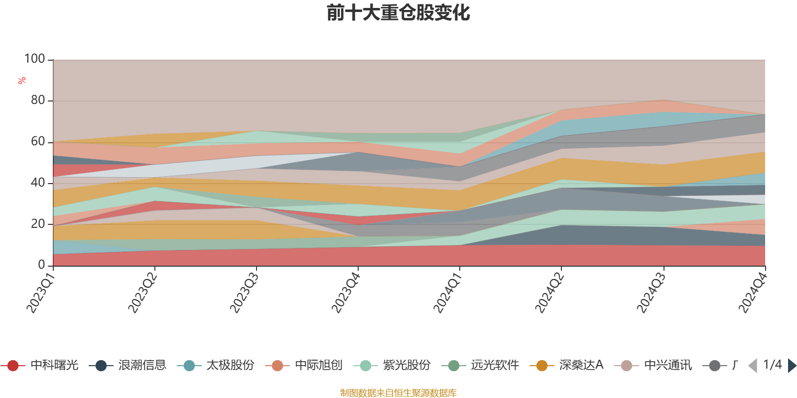 该基金持股集中度较高,近2年前十大重仓股集中度长期超过60%。截至2024年四季度末,基金十大重仓股分别是海光信息、中科曙光、神州数码、中国软件、中际旭创、紫光股份、新易盛、浪潮信息、莱斯信息、兆易创新。