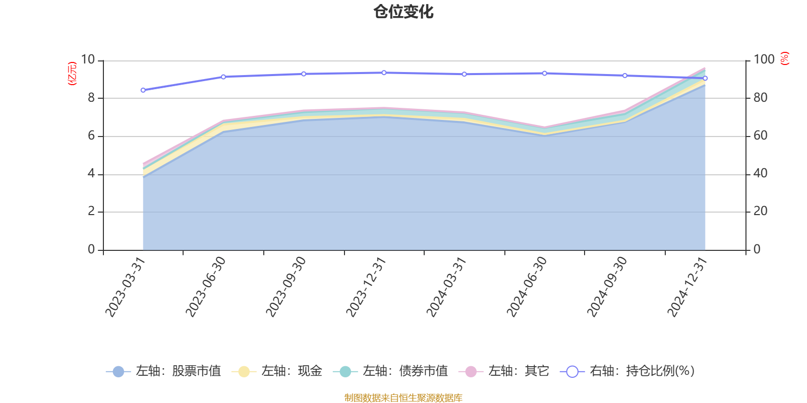 据定期报告数据统计,成立以来平均股票仓位为91.36%,同类平均为87.87%。2023年末基金达到93.58%的最高仓位,2023年一季度末最低,为84.35%。