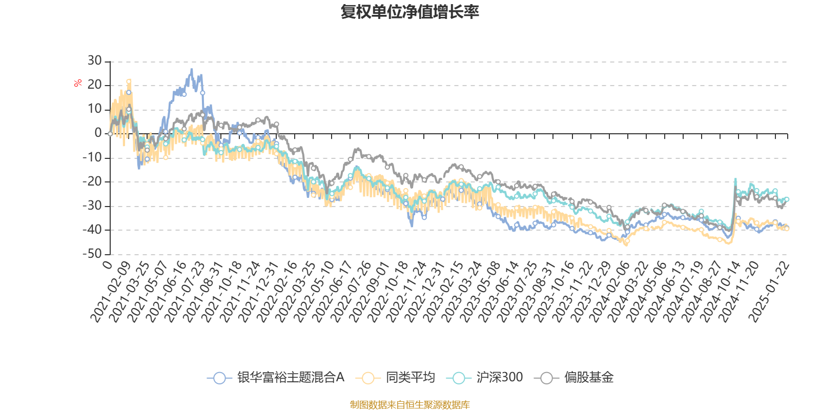 截至1月22日,银华富裕主题混合A近三个月复权单位净值增长率为-4.06%,位于同类可比基金8/17;近半年复权单位净值增长率为-3.81%,位于同类可比基金15/17;近一年复权单位净值增长率为10.54%,位于同类可比基金7/16;近三年复权单位净值增长率为-28.59%,位于同类可比基金8/15。