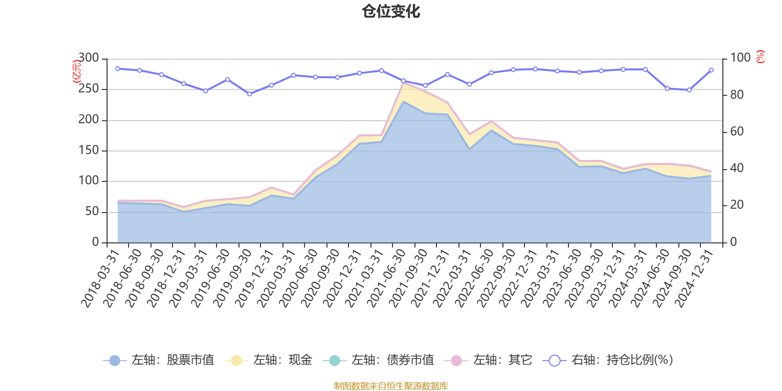 据定期报告数据统计,近三年平均股票仓位为91.25%,同类平均为85.26%。2018年一季度末基金达到94.57%的最高仓位,2019年三季度末最低,为80.82%。