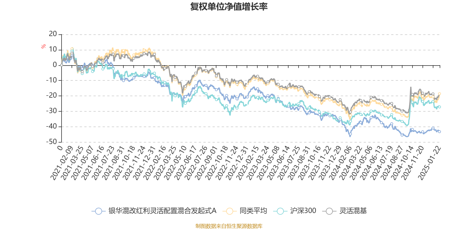 截至1月22日,银华混改红利灵活配置混合发起式A近三个月复权单位净值增长率为-1.16%,位于同类可比基金454/920;近半年复权单位净值增长率为-8.19%,位于同类可比基金902/920;近一年复权单位净值增长率为0.07%,位于同类可比基金825/920;近三年复权单位净值增长率为-35.94%,位于同类可比基金765/898。