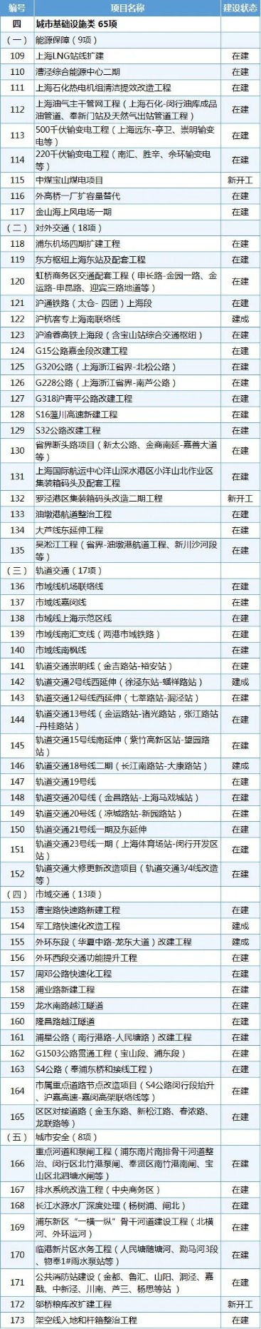 城市基础设施类重大项目集中了一批铁路轨交、市政路桥、能源保障项目,直接关系到千万市民的生活感受度。在今年安排的65个项目中,计划建成的有5项,包括沪杭客专上海南联络线、轨道交通2号线西延伸(徐泾东站-蟠祥路站)、轨道交通18号线二期(长江南路站-大康路站)、军工路快速化改造工程、外环东段(华夏中路-龙东大道)改建工程。计划新开工3项,有中煤宝山煤电项目、罗泾港区集装箱码头改造二期工程、邬桥粮库改扩建工程。