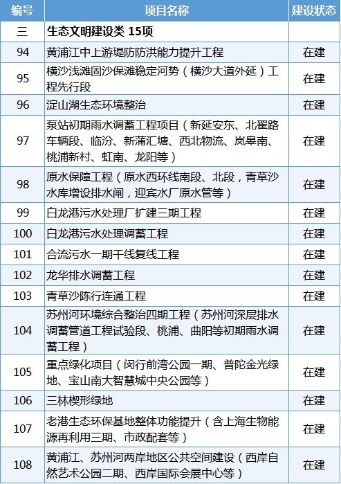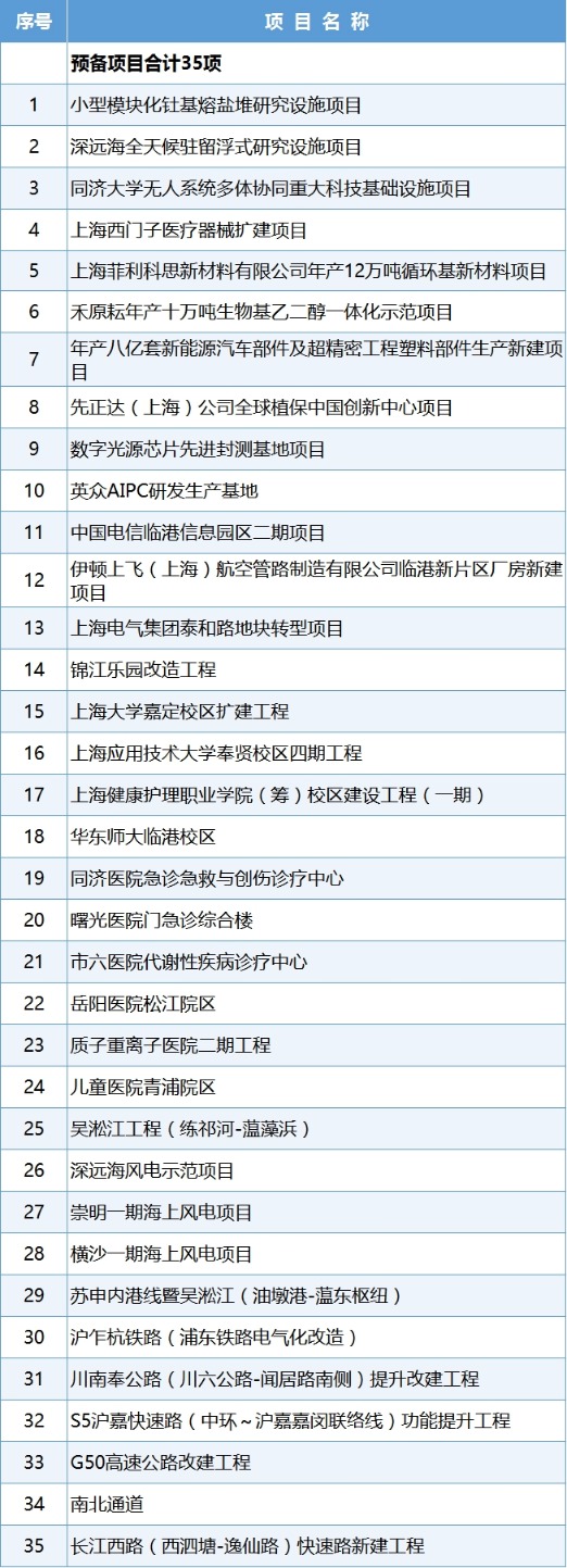 值得一提的是,今年上海还安排了35个预备项目,也就是现阶段手续尚未齐全,待齐全后近期准备实施的项目,比如南北通道、年产八亿套新能源汽车部件及超精密工程塑料部件生产新建项目、吴淞江工程(练祁河-蕰藻浜)、崇明和横沙一期海上风电项目等。