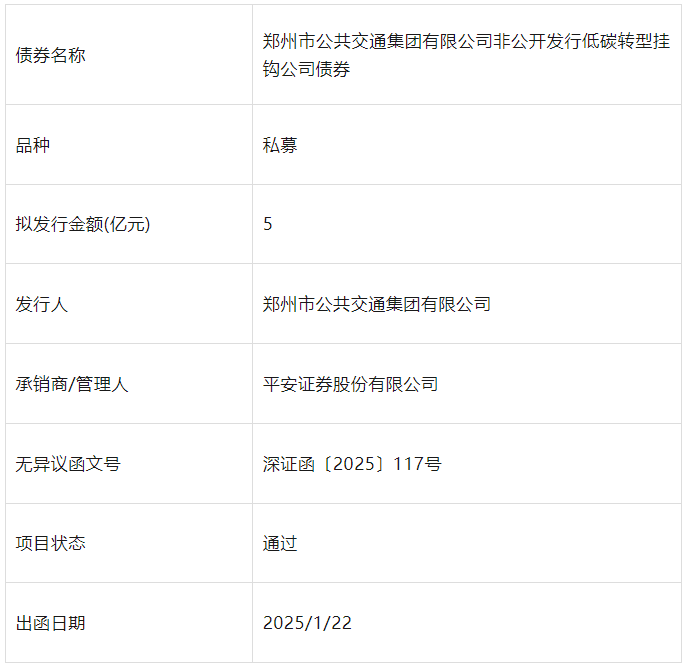 1月23日消息,郑州市公共交通集团有限公司非公开发行低碳转型挂钩公司债券项目获深交所通过。债券申报规模5亿元,类别为私募,承销商/管理人为平安证券。