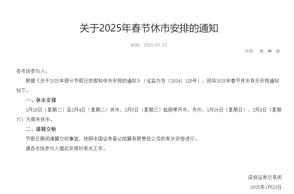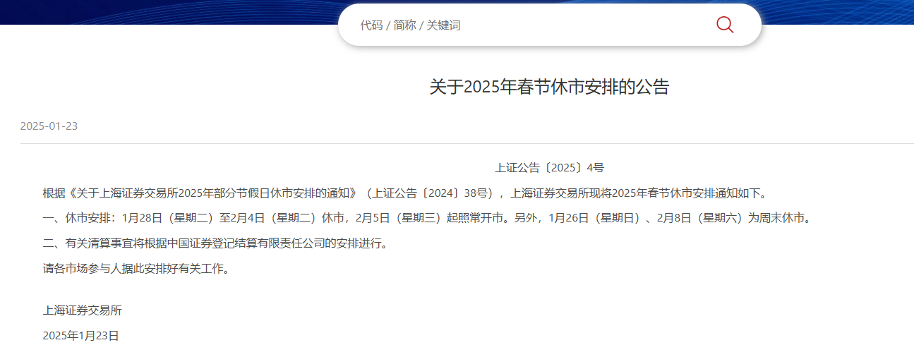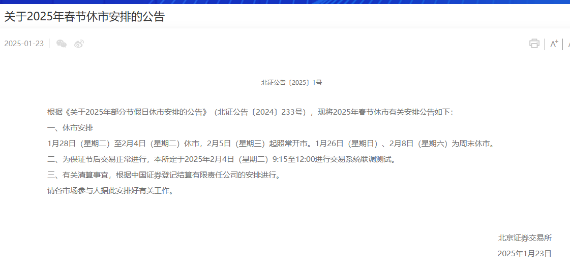 1月23日,沪深北交易所发布2025年春节休市安排。