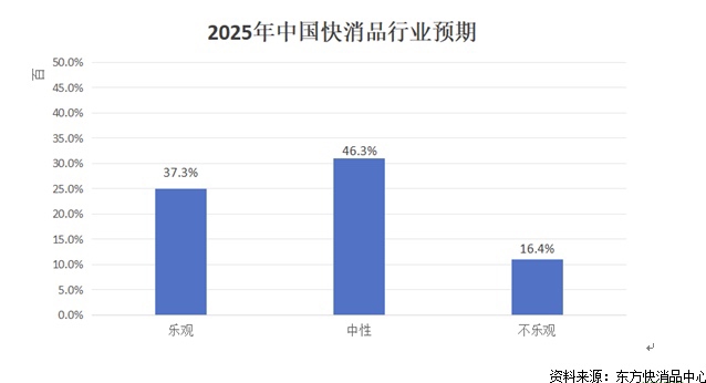 对于2025年预期,37.3%的企业高管持乐观态度,46.3%的企业高管表达了谨慎的态度,而有16.4%的企业高管对2025年持不乐观态度。中央经济工作会议指出,在2025年要抓好的九项重点任务中,把“大力提振消费、 全方位扩大国内需求”排在首位。东方快消品中心主任、《快消品》创始人陈杰博士表示,当前国家提振消费的促进措施目前主要面向耐用消费品的以旧换新,在快消品和服务消费涉及较少,建议相关政府部门对事关民生的消费品领域也出台包括发放消费券在内的促消费举措,大力提振消费信心。