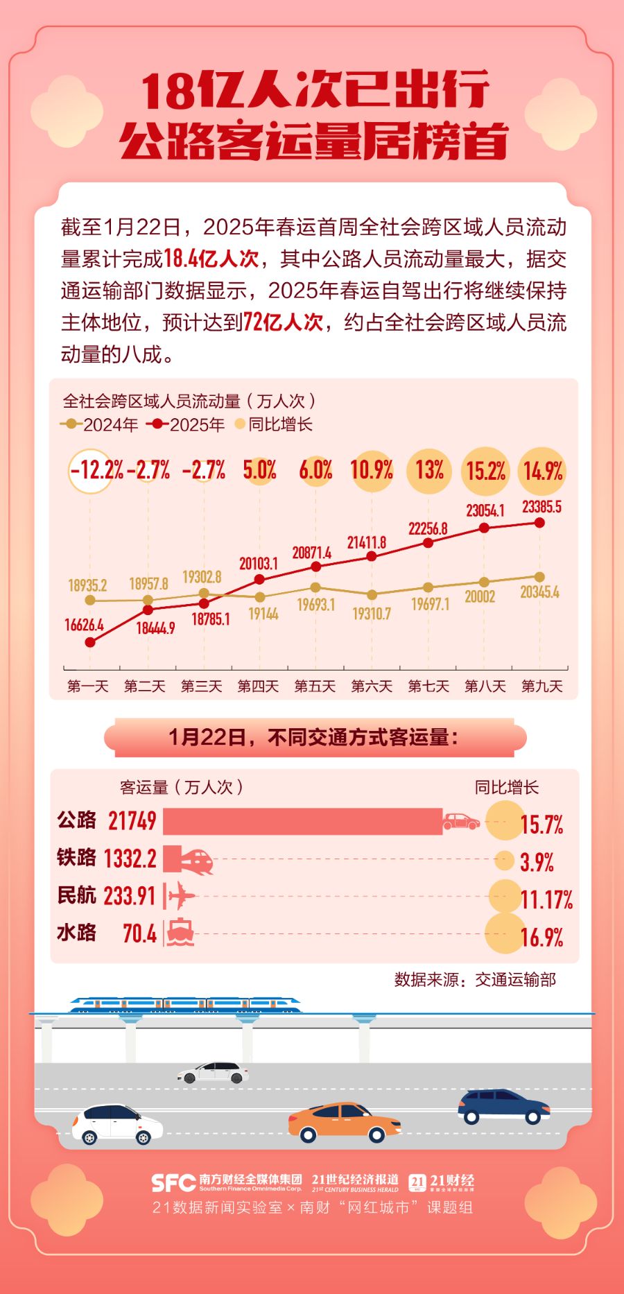 客流高速增长,“人潮”带动“人气”,2025年春运热热闹闹地拉开了序幕。据交通部门预测,今年春运期间全社会跨区域人员流动量将达到90亿人次左右,铁路、民航客运量有望分别突破5.1亿人次和9000万人次,规模在去年历史峰值的基础上进一步增加。