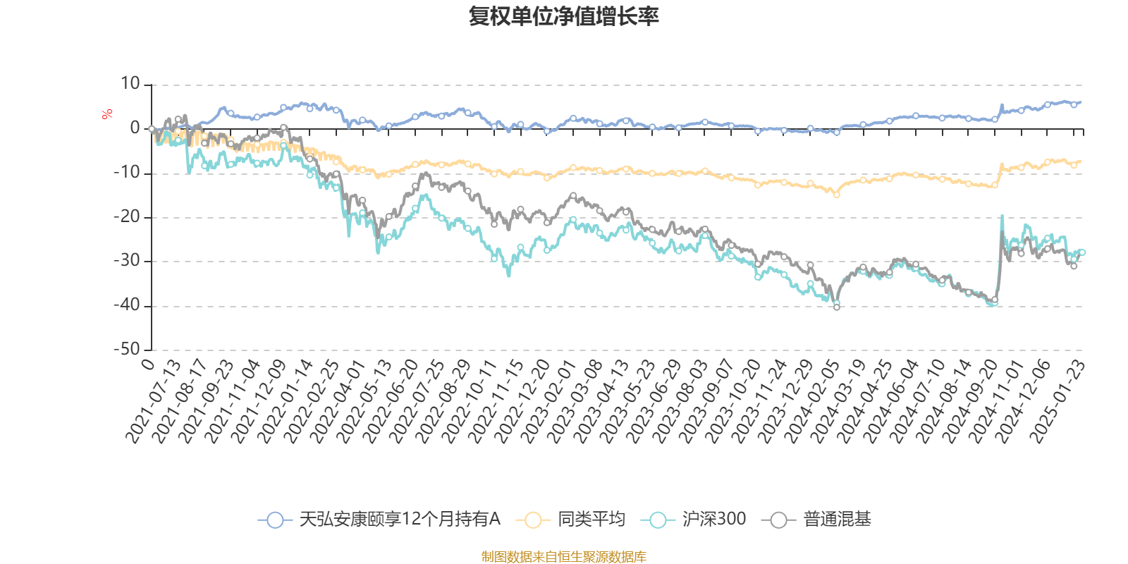 截至1月22日,天弘安康颐享12个月持有A近三个月复权单位净值增长率为1.64%,位于同类可比基金181/670;近半年复权单位净值增长率为2.84%,位于同类可比基金414/670;近一年复权单位净值增长率为6.80%,位于同类可比基金354/664;近三年复权单位净值增长率为0.63%,位于同类可比基金325/525。