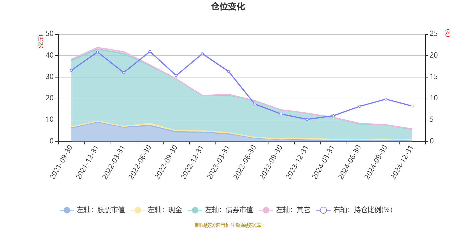 据定期报告数据统计,近三年平均股票仓位为11.81%,同类平均为18.74%。2022年上半年末基金达到20.97%的最高仓位,2023年末最低,为5.16%。