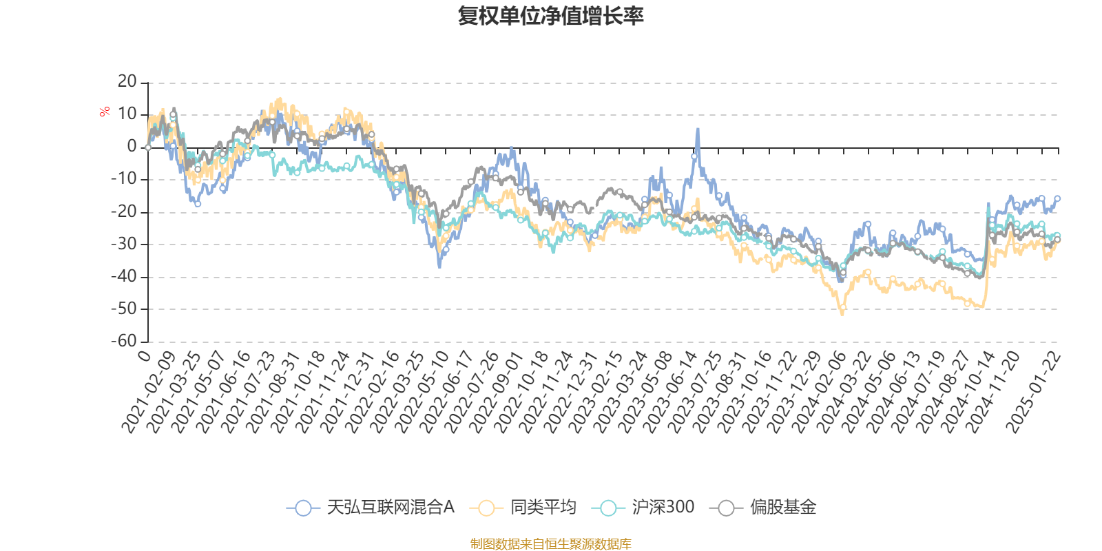 截至1月22日,天弘互联网混合A近三个月复权单位净值增长率为4.97%,位于同类可比基金73/202;近半年复权单位净值增长率为12.57%,位于同类可比基金172/202;近一年复权单位净值增长率为35.51%,位于同类可比基金81/191;近三年复权单位净值增长率为-9.05%,位于同类可比基金48/130。