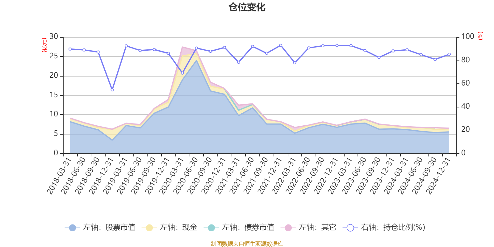 据定期报告数据统计,近三年平均股票仓位为87.09%,同类平均为84.66%。2021年末基金达到92.9%的最高仓位,2018年末最低,为54.58%。
