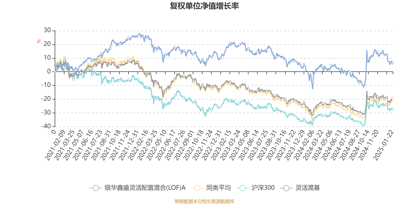 截至1月22日,银华鑫盛灵活配置混合(LOF)A近三个月复权单位净值增长率为-4.00%,位于同类可比基金696/920;近半年复权单位净值增长率为6.79%,位于同类可比基金515/920;近一年复权单位净值增长率为13.94%,位于同类可比基金422/920;近三年复权单位净值增长率为-15.91%,位于同类可比基金297/898。