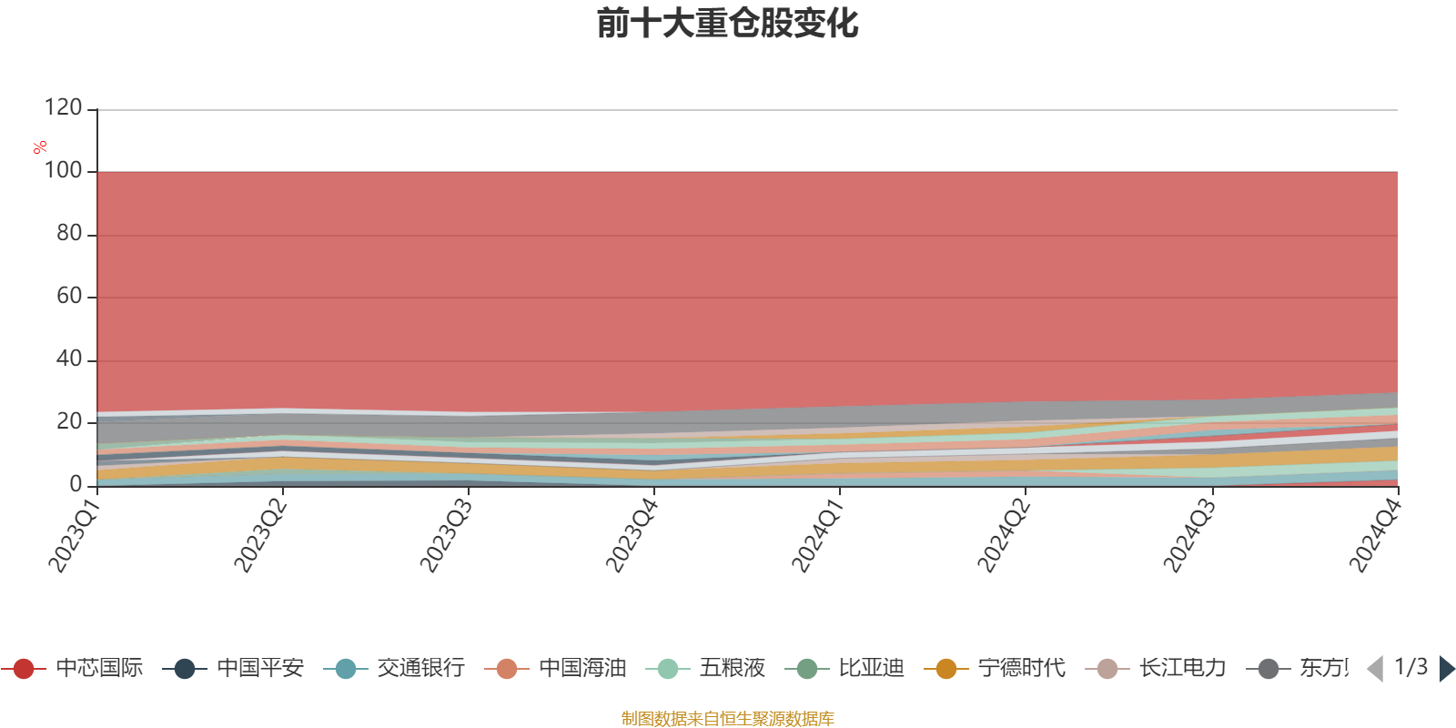截至2024年四季度末,基金十大重仓股分别是贵州茅台、宁德时代、五粮液、交通银行、中国银行、东方财富、招商公路、美的集团、北方华创、中芯国际。